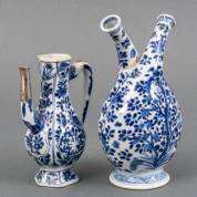 Chinees porseleinen schenkkannetje met blauw-wit decor en 2e gehalte zilveren monturen, Kangxi -oor gelijmd, schilfers, en deksel ontbreekt-, en Chinees porseleinen olie-en-azijn vaasje, Kangxi -beide halsjes gelijmd-, 20 cm