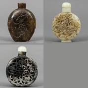Drie diverse natuurstenen snuifflesjes met reliëfdecor: kostbaarheden, Chinees karakter omgeven door vleermuizen, en tempelleeuw