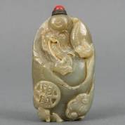 Chinees natuurstenen snuifflesje met reliëfdecor: wijsgeer met amulet en vleermuis, de glazen dop met metalen montuur, 19e eeuw, 8,5 cm