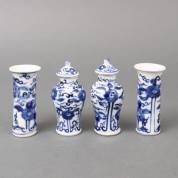 Vierdelig Chinees porseleinen miniatuurkaststel met blauw-wit floraal decor, 19e eeuw -beide dekselvaasjes gelijmd en één kastvaasje met randchip-, 9 cm