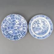 Chinees porseleinen bord met blauw-wit decor van bloementuin met vogels, gemerkt, Kangxi -gelijmd-, en Chinees porseleinen bord met blauw-wit tuindecor, Qianlong -randchips-, Ø 24,75 cm