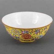 Chinees porseleinen famille rose kommetje, decor: karakters, perziken en vleermuizen op geel fond, Guangxu gemerkt, modern, 6,5 x Ø 14,5 cm