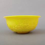 Chinese gele Pekingglazen kom met reliëfdecor van een vogel en bloemen, modern, 8 x 18 cm