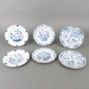 Zes diverse Chinees porseleinen borden met blauw-witte florale decors, 18e eeuw -alle borden met defecten-, Ø 23 cm