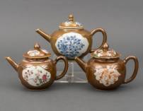 Drie diverse Chinees porseleinen theepotjes met bloemdecors in cartouches tegen capucijner fond, 18e eeuw -defecten en één deksel niet origineel-