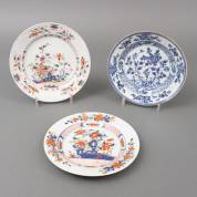 Chinees porseleinen Imari verte bord, famille rose bord en blauw-wit bord, alle drie met bloemdecor, 18e eeuw -enkele randchips-, Ø 22,5 cm