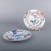 Chinees porseleinen Imari bord met pagodedecor -haarlijn-, en Chinees porseleinen Imari bord met bamboedecor, beide 18e eeuw, Ø 23 cm