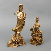 Twee messing beelden: Guanyin met fles in haar handen -tuit fles verbogen-, en Guanyin staand op een draak, beide China, modern, 35 cm