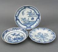 Drie diverse Chinees porseleinen diepe borden met blauw-witte decors: koekoek in huisje, bloemen met vruchten, en familie in tuin, alle 18e eeuw -alle haarlijnen en chips-, Ø 25 cm