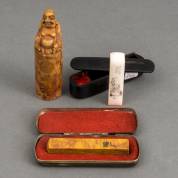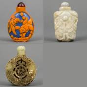 Twee diverse natuurstenen snuifflesjes met reliëfdecor: Chinees karakter omgeven door tweekoppige leeuw, en tempelleeuwen, en Chinees glazen snuifflesje met oranje-blauw vissendecor -deksel manco-