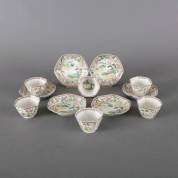 Zes octagonale Japans porseleinen famille rose kommetjes en schoteltjes met landschapsdecor, Kangxi gemerkt, 19e eeuw -één kommetje met chip, één met barst, één schoteltjes gerestaureerd-, Ø 12 cm