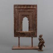Indiaas bronzen beeldje, vermoedelijk Parvati, en oosters houten raamwerkje op metalen basement