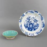 Chinees porseleinen schotel met blauw-wit decor: rots in een tuin, Kangxi -volledig gerestaureerd-, en Chinees 'straits' porseleinen kom op voet met polychroom decor, Ø 37,5 cm