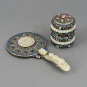 BWZG filigrain dekseldoosje met ingezette steentjes, en handspiegel in BWZG filigrain montuur met ingelegde steentjes en jade handvat, beide China, 20e eeuw -verlijming achterzijde spiegel zichtbaar aan voorzijde-, 25 cm