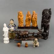 Drie Chinees houten beeldjes: onsterfelijken, blanc de Chine beeldje: Guanyin, Indonesisch houten beeldje: twee mannen achter een ploeg, twee houten netsuke, etc. -kleine defecten-, 35 cm