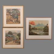 Indonesische School: drie aquarels: twee dorpsgezichten, gesigneerd Soewardja (1900-?), en één gezicht op rijstvelden, gesigneerd 'D. Djohan' -enkele lichte verkleuringen-