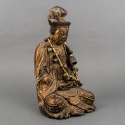 Chinees houten beeld: zittende Guanyin, met resten van verguldsel en polychromie, haar handen gevouwen op schoot, Ming-stijl, 20e eeuw, daarbij: bamboe ketting met bronzen bellen, 50 cm