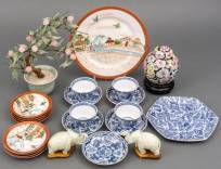Miniatuurboom van halfedelsteen en glas, paar halfedelsteen olifantjes, en divers Chinees en Japans porselein, Ø 25,5 cm
