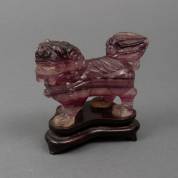Chinees paars fluoriet beeld: tempelleeuw, 19e eeuw, op houten basement, herkomst: Juwelier Esmann -achterpoten gelijmd, chipjes-, 12 x 6 x 10 cm