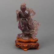 Chinees paars fluoriet beeld: daoïstische godin -defecten-, op houten basement, 18 x 10 x 5 cm