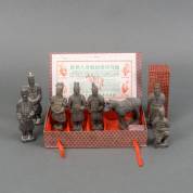 Acht grijze terracotta beeldjes: verkleinde replica's van het Chinese terracottaleger, bestaand uit: zes soldaten, een hoogwaardigheidsbekleder, en een paard, inclusief twee verpakkingsdoosjes