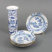 Vier Chinees porseleinen papbordjes met blauw-wit bloemdecor, Qianlong -randschilfers en defecten-, en Chinees porseleinen kastvaas met blauw-wit figurendecor, omringd door takken van de pruimenboom, Xuande gemerkt, 19e eeuw -randschilfertje opening-, 20,5 cm