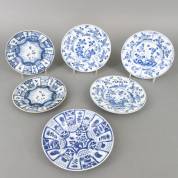 Zes diverse kleine Chinees porseleinen borden met blauw-witte florale decors, waaronder een serie van drie, alle eerste helft 18e eeuw -alle met defecten-, Ø 21 cm