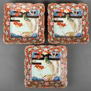 Serie van drie vierkante Japans porseleinen borden met vogeldecor -kleine chips-, 21 x 21 x 3,5 cm