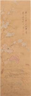 Chinese schildering op zijde: bloesemtakken en pioenrozen aan de waterkant, gesigneerd Xiquan, 20e eeuw, 112 x 32 cm