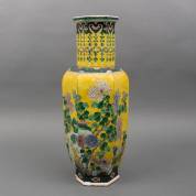 Gefacetteerde Chinees porseleinen famille jaune vaas met famille verte bloemdecor, Kangxi gemerkt, vermoedelijk Guangxu -chip van de voet en bodembarst-, 56 x Ø 20 cm