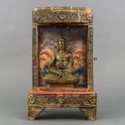 Chinees messing beeld: Padmasambhava, in rijk gedecoreerde tafelvitrine met verguld floraal decor en rode accenten, 20e eeuw, 24 cm