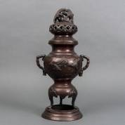 Bronzen wierookbrander kôro, de poten met olifantdecor, bamboevormige handvatten, vogeldecor in cartouche en het handvat in de vorm van een draak, Kyôto, Japan, gemerkt Yoshida, circa 1870, 44,5 cm