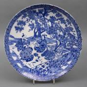 Japans porseleinen schotel met blauw-wit transferdecor van figuren in het park, gemerkt, begin 20e eeuw, Ø 40 cm