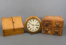 Mahonie brievenkastje, eiken archiefladekastje, en oude wandklok in houten kast -defecten aan koperen rand-, Ø 33 cm