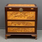 Houten kast met twee laden, daarboven een hoog opbergvak met klep, het geheel met rijk gesneden decor in Chinese stijl, 20e eeuw -gebruikssporen-, 104 x 100 x 54 cm