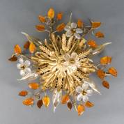 Verguld metalen bloemvormige plafonnière met bruinglazen blaadjes, en bloemen samengesteld uit helderglazen pegels, Ø 40 cm