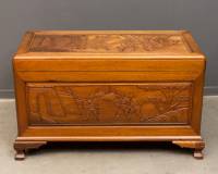 Djatihouten kamferkist met gesneden reliëfdecor van krijgers, China, tweede helft 20e eeuw, 62 x 106 x 55 cm