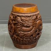 Houten tonvormige kruk met rijk gesneden drakendecor, China, 20e eeuw, 45 x Ø 38 cm