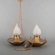 Twee ronde messing éénlichts hanglampen met gesatineerd glazen vlamvormige kappen, eerste helft 20e eeuw -één puntje van kap defect, randschilfers aan beide zetringen-, 43 x Ø 38 cm