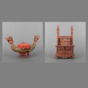 Gesneden en beschilderd houten dekselpot voorzien van twee zeemonsters, daarbij: kleine gesneden en beschilderd houten spiegelstandaard, Indonesië -spiegel ontbreekt-, 36 x 59 x 20 en 60 x 33 x 19,5 cm