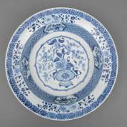 Chinees porseleinen diepe schotel met blauw-wit decor: bloemenmand, Yongzheng/Qianlong -rand gelijmd, barsten-, Ø 36 x 7,5 cm