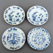 Vier Chinees porseleinen borden met blauw-witte decors, waaronder een paar, alle 18e eeuw -defecten-, Ø 22.5 cm