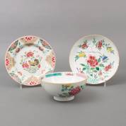 Chinees porseleinen famille rose kom en twee diverse famille rose borden, 18e eeuw -defecten-, 8,5 x Ø 18 cm