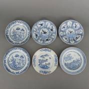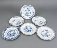 Zes diverse Chinees porseleinen borden met blauw-witte decors, Qianlong -defecten-, Ø 23 cm