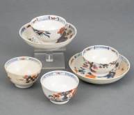 Chinees porseleinen Imari schoteltje en twee kommetjes met tuindecor, en Imari schoteltje en twee kommetjes met vlinder- en bloemdecor, 19e eeuw -defecten-, 5,25 x Ø 13,25 cm