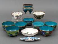 Zeven cloisonné kommetjes en wierookvat, twee polychroom emaille bakjes en kwispedoor, en een porseleinen beschilderd kommetje, alle China, 19e/20e eeuw -defecten-