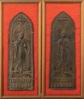 Paar bronzen plaquettes van lopende Boeddha, Thailand -eentje gelijmd-, 46,5 x 20 cm