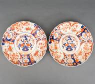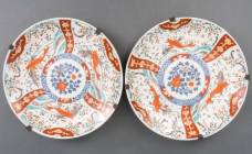Paar Japans porseleinen Imari schotels met bloemenmanddecor, 19e eeuw, 6 x Ø 41,5 cm