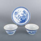 Twee Chinees porseleinen kommen en diep bord met blauw-witte decors, Jiaqing -alle met randschilfers en -chips-