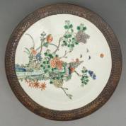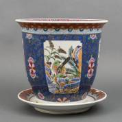 Japans porseleinen cache-pot met polychroom bloem- en vogeldecor, staand op onderschotel, 20e eeuw, 34 x Ø 36 cm